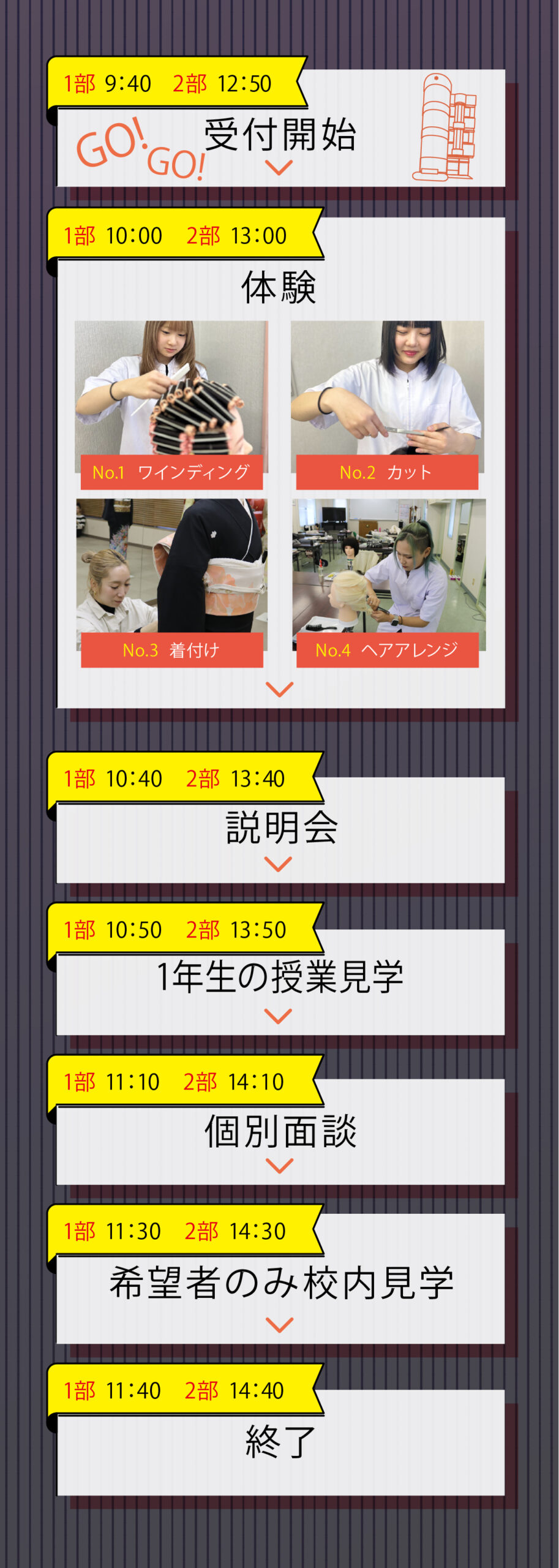 4月11日・25日(土) 新学期を迎えた楽しいKOTOへ来てください。新2年生と共に色んな楽しい体験ができますよ~♪ 5月9日・23日(土) 5月からの体験はアレンジヘアと浴衣着付けがオススメ☆ 6月13日・27日(土) 6月1日~AO入試スタート! 7月11日・25日(土) KOTOのオープンキャンパスで、美容の仕事の素晴らしいところを体験してください☆ 8月19日(水)・20日(木)・21日(金) 参加特典もあります、ご予約お待ちしております🎵 |